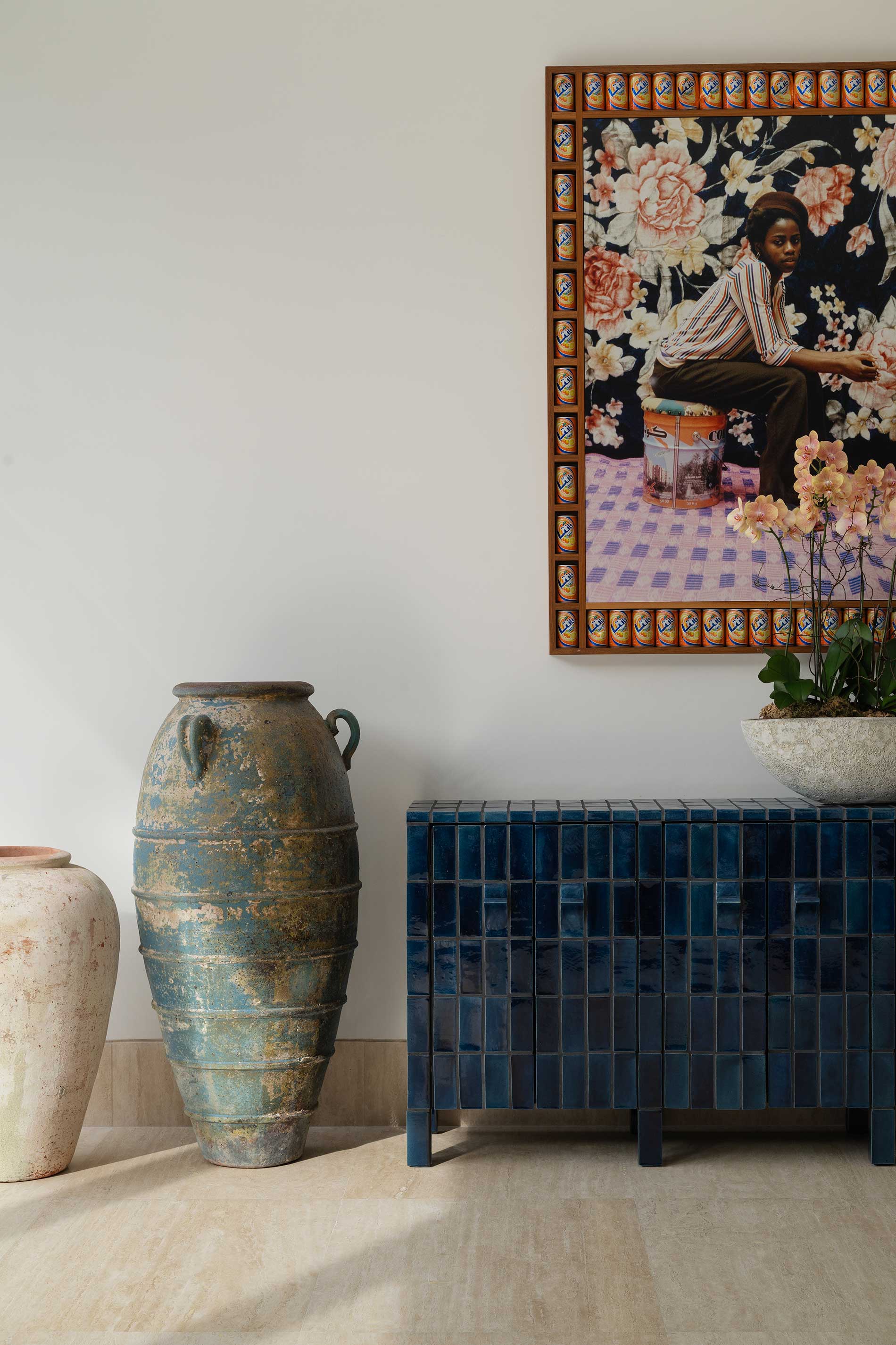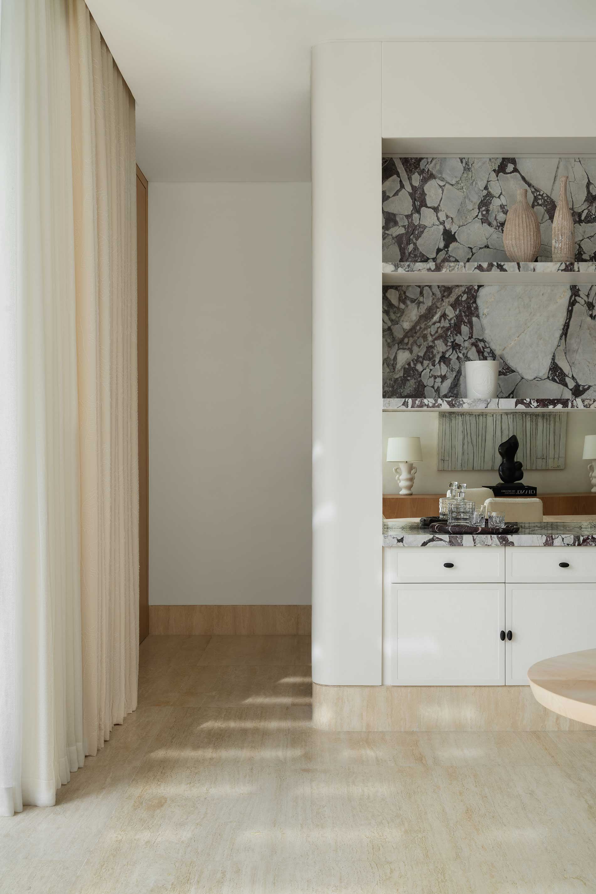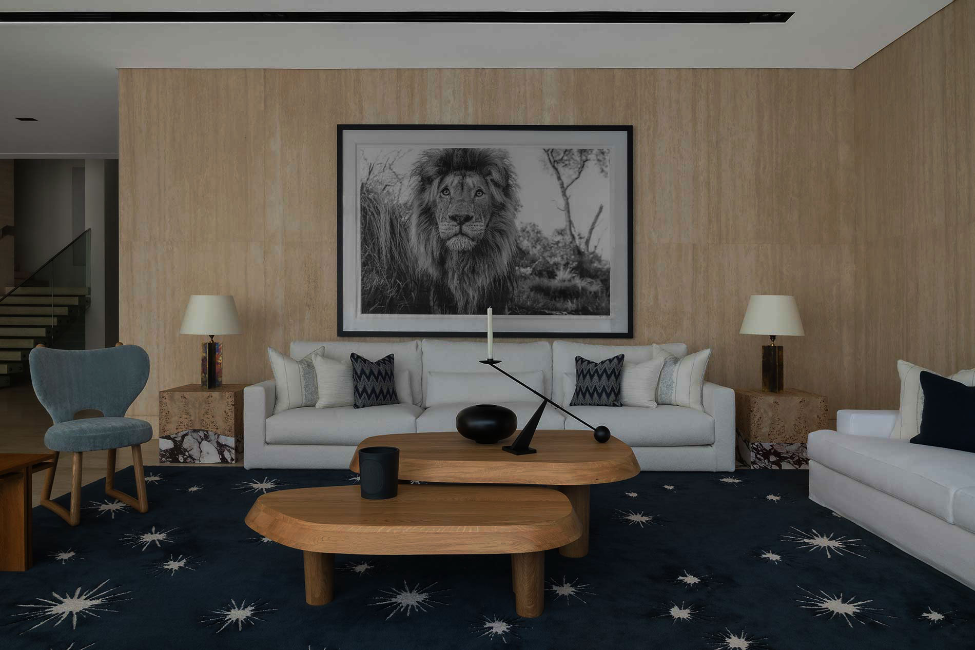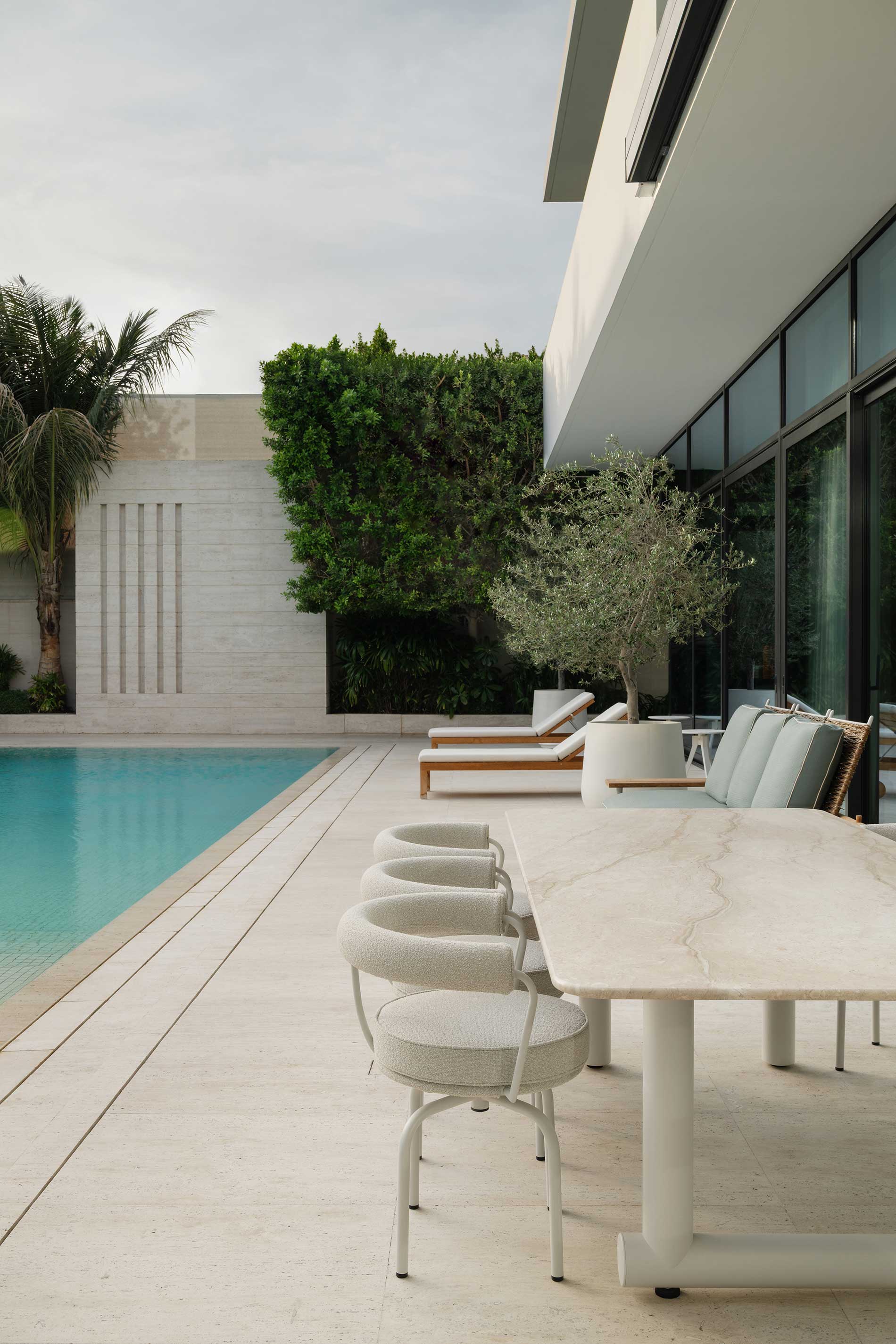 THIS FAMILY VILLA IN DUBAI WAS REIMAGINED WITH OUR SOULFUL APPROACH TO DESIGN, AN AESTHETIC THAT BALANCES SERENITY WITH CHARACTER. INSPIRED BY THE SURROUNDING DESERT LANDSCAPE AND THE NEARBY SEA, WE CREATED A SOOTHING, NEUTRAL BASE AND INFUSED IT WITH VIBRANT ACCENTS IN SHADES OF TURQUOISE AND BLUE, ECHOING THE COLORS OF THE OCEAN. EVERY DETAIL WAS INTENTIONAL: ANTIQUE PIECES WERE CAREFULLY SOURCED ACROSS EUROPE, WHILE EXPRESSIVE FURNITURE AND CUSTOM JOINERY WERE CRAFTED IN COLLABORATION WITH EUROPEAN ARTISANS. LOCALLY SOURCED MARBLE GROUNDS THE SPACE IN ITS ENVIRONMENT, WHILE BESPOKE FURNITURE PIECES - DESIGNED IN OUR STUDIO AND MADE IN OUR WORKSHOP IN ITALY - ADD A TACTILE RICHNESS. THE FINAL RESULT IS A HOME THAT FEELS CALM YET EXPRESSIVE, ELEGANTLY LAYERED WITH TEXTURES, TONES, AND PERSONALITY, PERFECTLY COMPLEMENTING THE CLIENT'S ART COLLECTION.