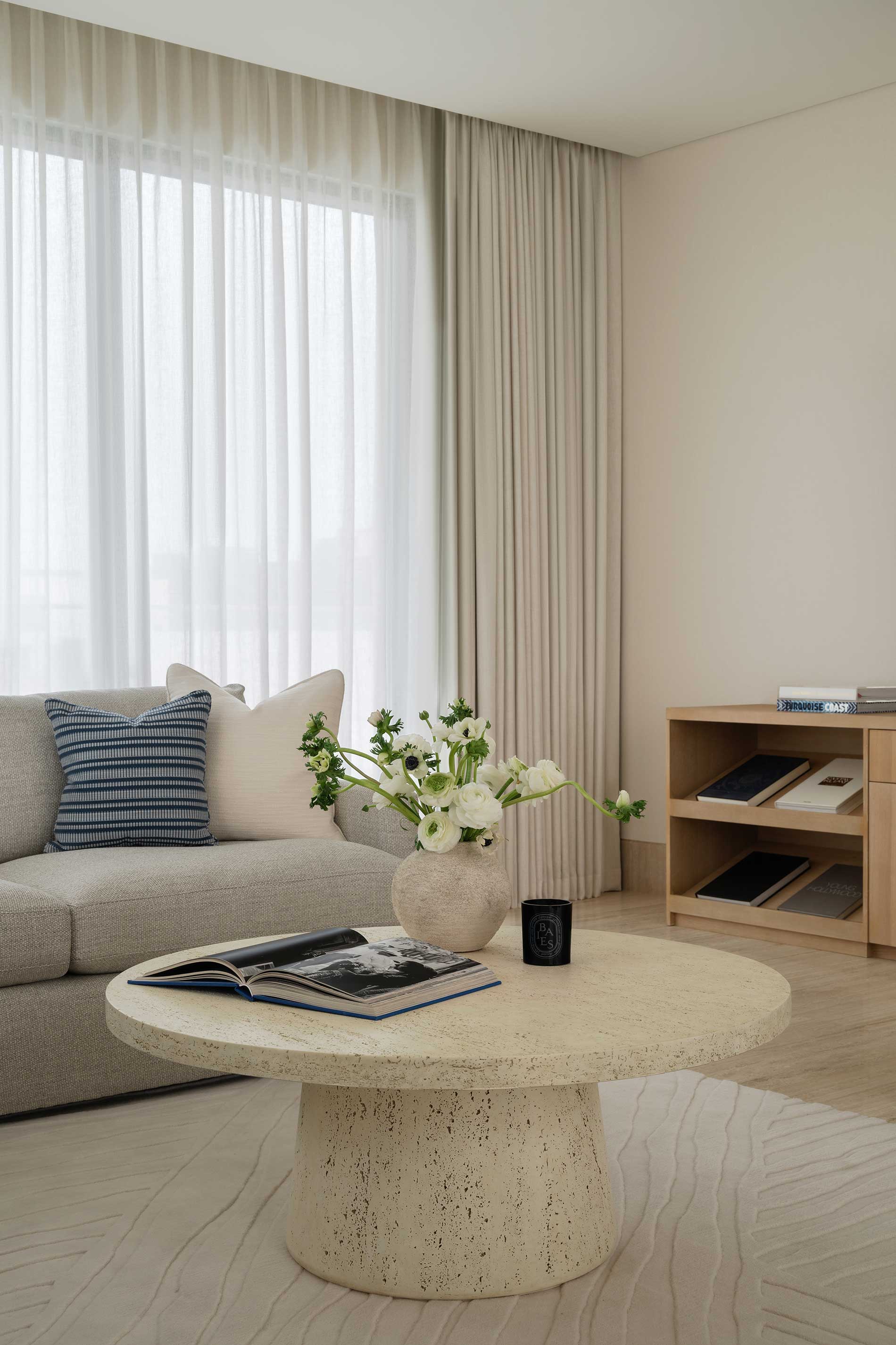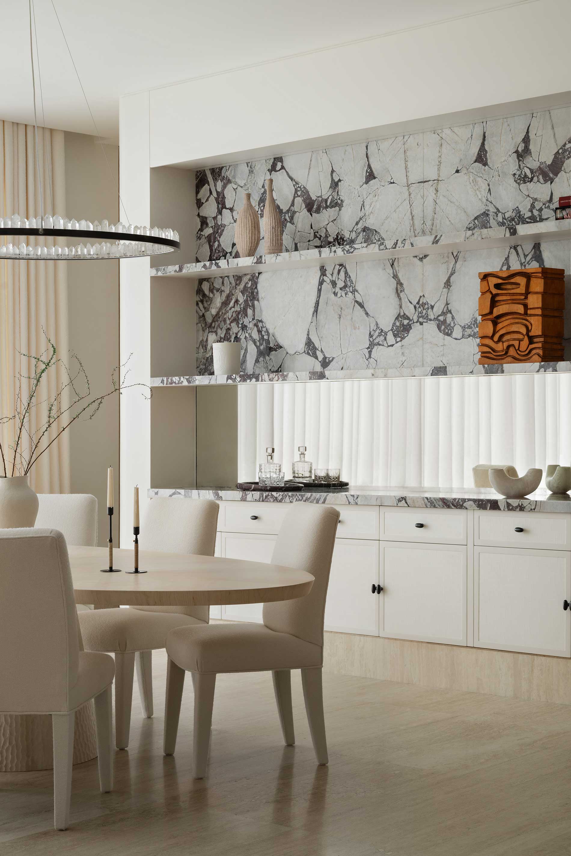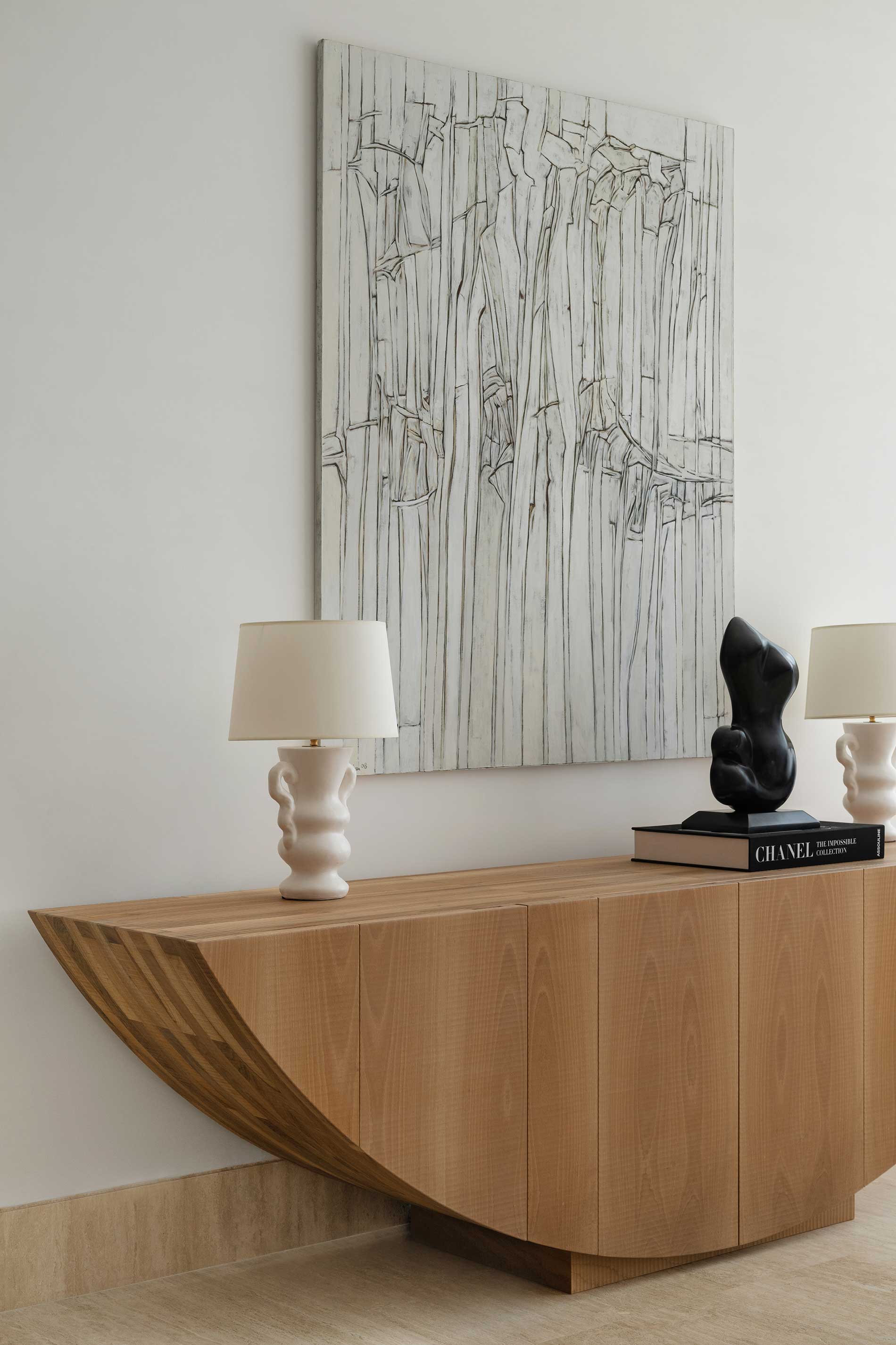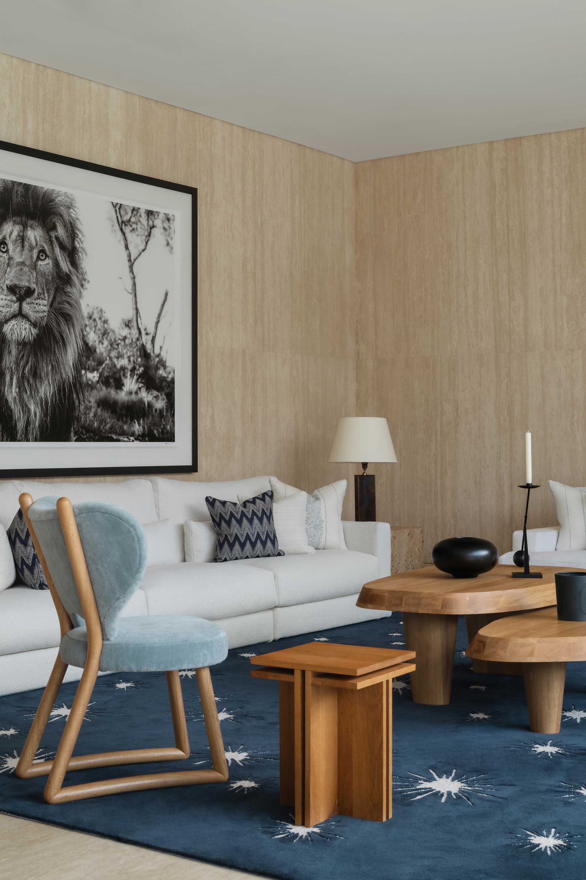 THIS FAMILY VILLA IN DUBAI WAS REIMAGINED WITH OUR SOULFUL APPROACH TO DESIGN, AN AESTHETIC THAT BALANCES SERENITY WITH CHARACTER. INSPIRED BY THE SURROUNDING DESERT LANDSCAPE AND THE NEARBY SEA, WE CREATED A SOOTHING, NEUTRAL BASE AND INFUSED IT WITH VIBRANT ACCENTS IN SHADES OF TURQUOISE AND BLUE, ECHOING THE COLORS OF THE OCEAN. EVERY DETAIL WAS INTENTIONAL: ANTIQUE PIECES WERE CAREFULLY SOURCED ACROSS EUROPE, WHILE EXPRESSIVE FURNITURE AND CUSTOM JOINERY WERE CRAFTED IN COLLABORATION WITH EUROPEAN ARTISANS. LOCALLY SOURCED MARBLE GROUNDS THE SPACE IN ITS ENVIRONMENT, WHILE BESPOKE FURNITURE PIECES - DESIGNED IN OUR STUDIO AND MADE IN OUR WORKSHOP IN ITALY - ADD A TACTILE RICHNESS. THE FINAL RESULT IS A HOME THAT FEELS CALM YET EXPRESSIVE, ELEGANTLY LAYERED WITH TEXTURES, TONES, AND PERSONALITY, PERFECTLY COMPLEMENTING THE CLIENT'S ART COLLECTION.